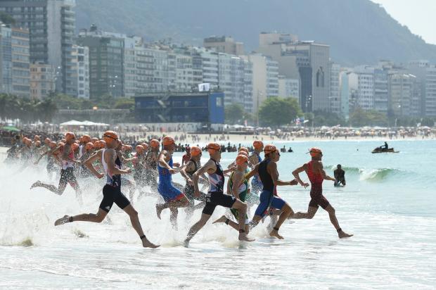 30. Hình ảnh các vận động viên đua nhâu chạy xuống nước để bắt đầu phần thi bơi, thuộc nội dung 3 môn phối hợp nam Bãi biển Fort Copacabana, Rio 2016 .