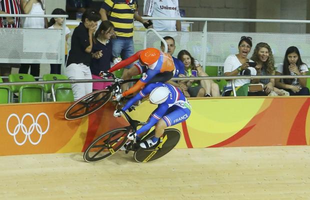32. Hai vận động viên Laurine van Riessen của Hà Lan và Virginie Cueff của Pháp có màn rượt đuổi nguy hiểm khi đang thi đấu vòng đầu tiên bộ môn xe đạp lòng chảo, nội dung kerin, vòng đầu tiên.