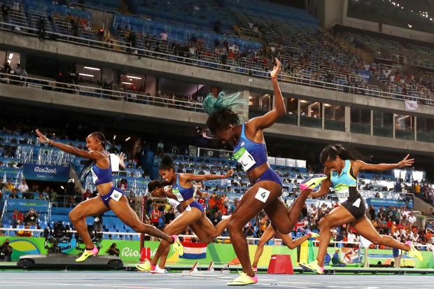 34. Khoảng khắc chiến thắng huy chương vàng của vận động viên Brianna Rollins, Hoa Kỳ (trái ) nội dung 100m vượt rào nữ trước huy chương bạc Nia Ali và huy chương đồng Kristi Castlin cùng của Hoa Kỳ vào ngày thi đấu thứ 12 Olympic Rio 2016.