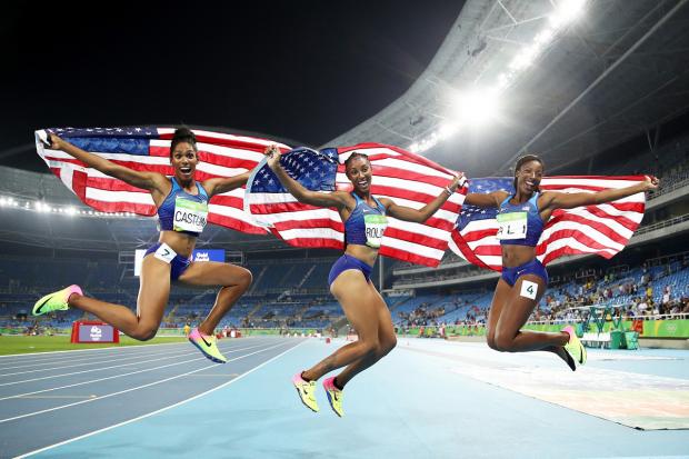 35. Từ trái sang , Vận động viên đoạt huy chương đồng Kristi Castlin , huy chương vàng Brianna Rollins và huy chương bạc Nia Ali của Hoa Kỳ ăn mừng với quốc kỳ Mỹ sau khi chiến thắng ở nội dung 100m vượt rào nữ, ngày thi đấu thứ 12 Olympic Rio 2016.