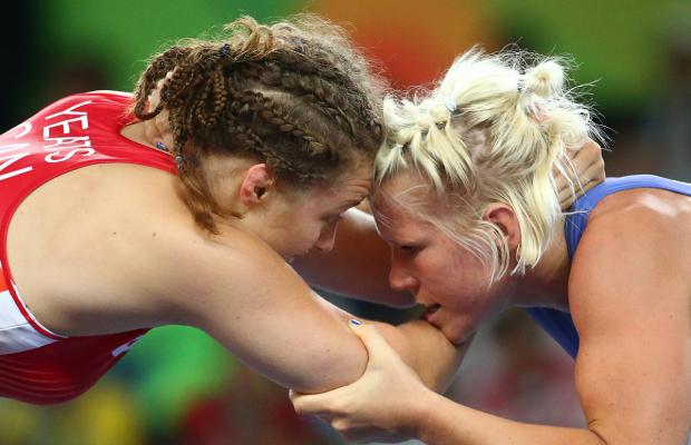 38. Hình ảnh Vận đông viên Dorothy Yeats của Canada và Jenny Fransson của Thụy Điển đang vật lộn, trong trận đấu giành huy chương đồng, nội dung vật tự do, hạng cân 69kg nữ.