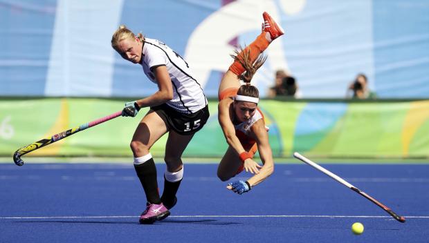 3. Vận động viên Eva de Goede của Hà Lan(bên phải) té ngã trong trong một pha tranh chấp với vận động viên Hannah Kruger của Đức, lượt trận bán kết Hockey nữ, Hà Lan gặp Đức.