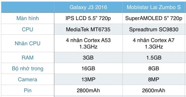 So về cấu hình, rõ ràng Lai Zumbo S mạnh mẽ hơn J3 2016 khá nhiều. Cùng được trang bị vi xử lý 4 nhân nhưng Zumbo S dùng 4 nhân Cortex A53 thay vì Cortex A7, một khác biệt khá lớn về hiệu năng. Ngoài ra, máy cũng có 3GB RAM thay vì 1.5GB.