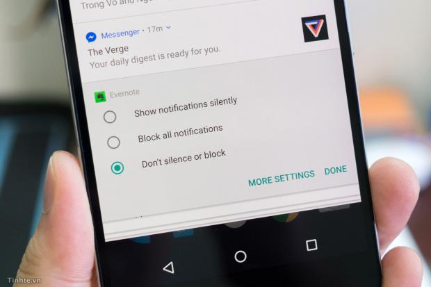 Nếu như ở Android 6.0 bạn phải chui vào settings để làm việc này thì Android 7.0 cho phép bạn nhấn giữ vào thông báo nào đó bạn không thích và xử ngay tại chỗ. Bạn sẽ có các tùy chọn như vẫn cho notification hiện nhưng không báo âm thanh, chặn luôn thông báo từ app đó hoặc không làm gì cả.