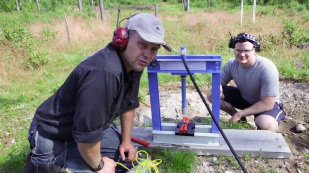 Hai người chuẩn bị làm thí nghiệm: dùng máy ép thủy lực ép lên khối thuốc nổ.
