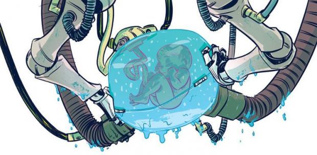 Hình vẽ minh họa một em bé được phát triển trong tử cung nhân tạo.