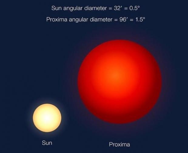Proxima Centauri là một ngôi sao nhỏ, nó chỉ lớn hơn một phần mười so với kích thước của Mặt Trời. Nếu nhìn từ Proxima b thì ngôi sao lùn nhỏ này sẽ lớn gấp 3 lần so với khi nhìn từ Trái Đất lên Mặt Trời. Đó là vì quỹ đạo của Proxima b thực sự rất, rất nhỏ. Hành tinh quay quanh ngôi sao chủ có khoảng cách 7,5 triệu km - chỉ bằng 5% khoảng cách giữa Trái Đất và Mặt Trời (khoảng 150 triệu km). Trong khi đó, Mặt Trời của chúng ta là một ngôi sao sáng khổng lồ trên bầu trời của Proxima b, mọi người trên thế giới cần chuẩn bị những thiết bị đặc biệt để có thể nhìn thấy đượcProxima Centauri.