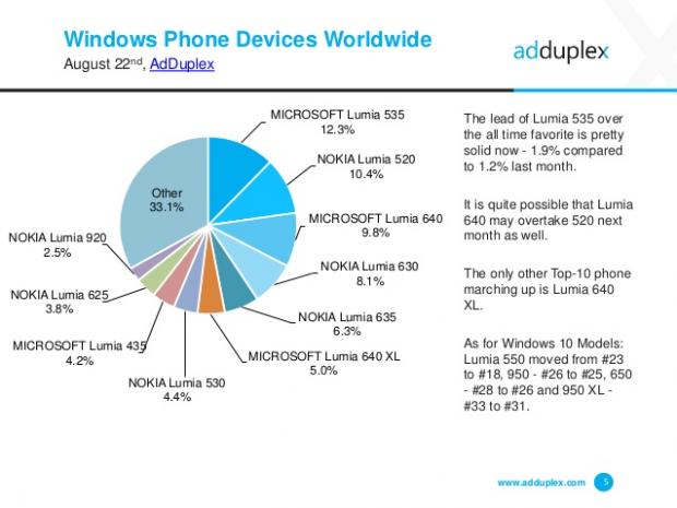Thống kê cũng cho thấy Lumia 535 vẫn là chiếc Lumia được nhiều người sử dụng nhất với 10.4% người dùng, tiếp đó là Lumia 640 (9.8%), Lumia 630 (8.1%) và Lumia 635 (6.3%).