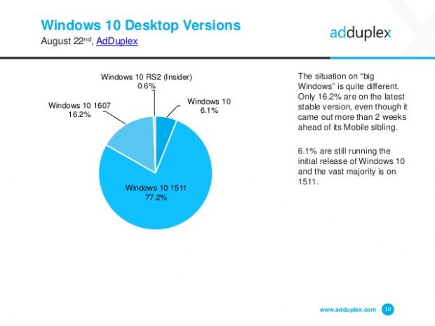 Trên thị trường máy tính, Windows 10 (PC) phiên bản 1511 đang được nhiều người dùng nhất với 77.2% trong số người dùng Windows 10. Phiên bản 1511 là bản November Update được Microsoft tung ra ngoài tháng 10 năm ngoái.