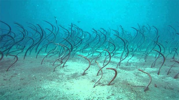 Đàn cá chình vườn giống hệt đám tóc dưới đáy biển. (Ảnh: Youtube).