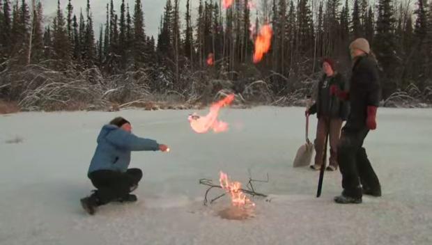 Khí metan thoát ra từ mặt hồ tại Alaska bốc cháy phừng phừng. (Ảnh: chụp từ clip).