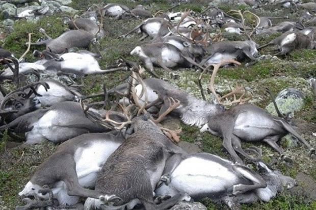 Xác tuần lộc chết la liệt trên đồng cỏ Na Uy. (Ảnh: Havard Kjotvedt/Cơ quan Môi trường Na Uy).