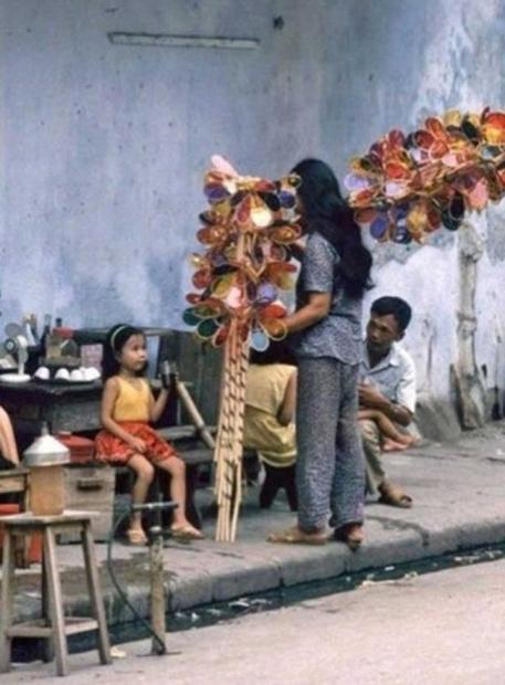 Hà Nội thập niên 1990, một cô bán đèn cù quay đang 'chào hàng' với một bé gái bên quán nước.