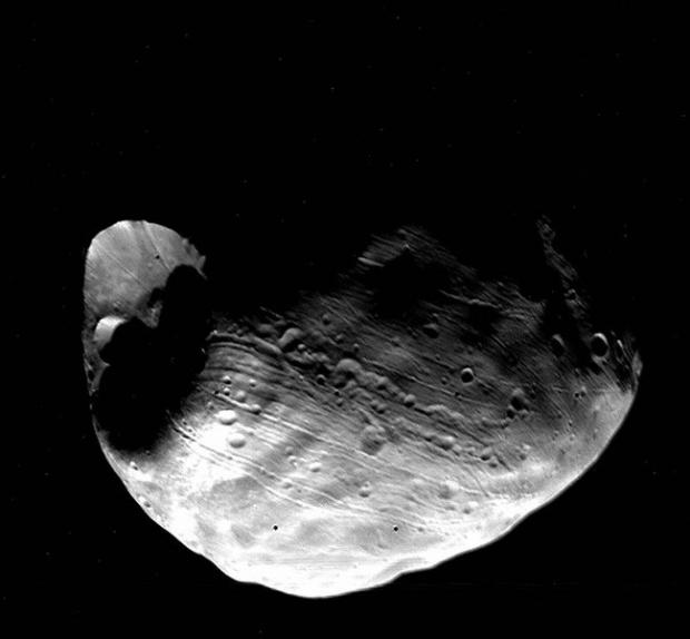 Tàu vũ trụ bay theo quỹ đạo Viking 1 là một trong những tàu vũ trụ đầu tiên đi đến sao Hỏa. Bức ảnh này được chụp vào ngày 10 tháng 6 năm 1977. Hình ảnh được chụp từ tàu vũ trụ Viking 1 cho thấy toàn bộ những vệt sọc, vết lõm sâu trên bề mặt của vệ tinh Phobos. Các nhà thiên văn học tìm thấy những rãnh dài song song tạo ra những khe nứt sâu hay những 'vết rạn dài' bị trọng lực hấp dẫn của sao Hỏa gây ra.