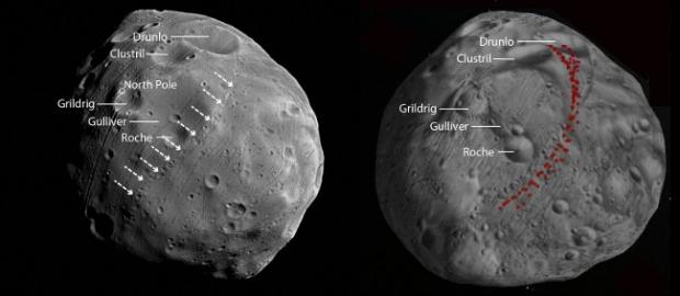 Michael Nayak và Erik Asphaug ở trường Đại học California và Santa Cruz đã tiến hành mô phỏng nghiên cứu trên máy tính để xác minh những giả thuyết về nguồn gốc các rãnh Phobos. Hình mô phỏng được thực hiện trên máy tính tạo ra mô hình diễn tả những tác động căn bản hoặc cú va chạm lúc ban đầu gây ra những vết lõm lớn và thổi bụi bẩn vào trong không gian. Kéo theo sau là những tác động thứ hai và tiếp theo đó là những mảnh vụn mặt trăng sẽ quay trở lại bề mặt Phobos. Mô hình một chuỗi những vết lõm ở hình phía bên trái giống với mô hình đã được tiên đoán (bên phải).