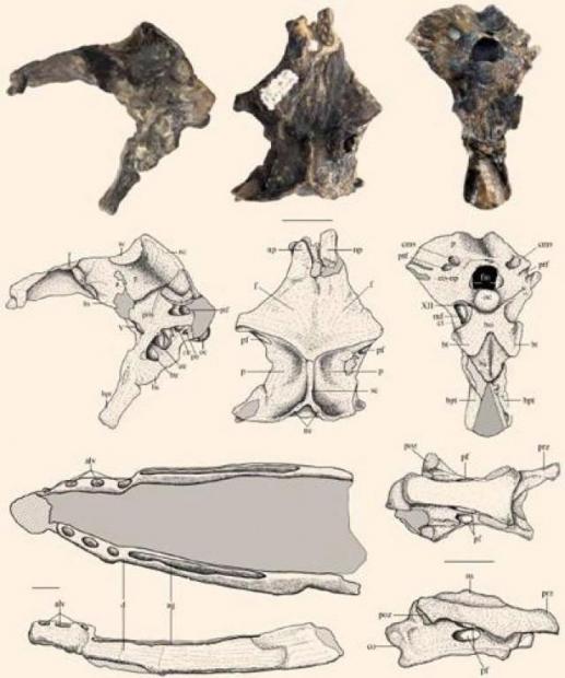 Các mảnh xương của Allkaruen koi: hộp sọ, hàm dưới và đốt sống cổ. (Ảnh: Codorniu L etal).
