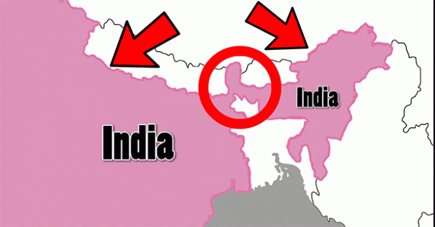 Một ví dụ khác chính là Ấn Độ chúng ta đã nêu trên. Bạn có thể thấy, 2 nửa của Ấn Độ được nối với nhau bởi một vùng đất siêu nhỏ, được gọi là 'cổ gà' (siligury corridor), với điểm hẹp nhất tại đây chỉ rộng khoảng 27km.