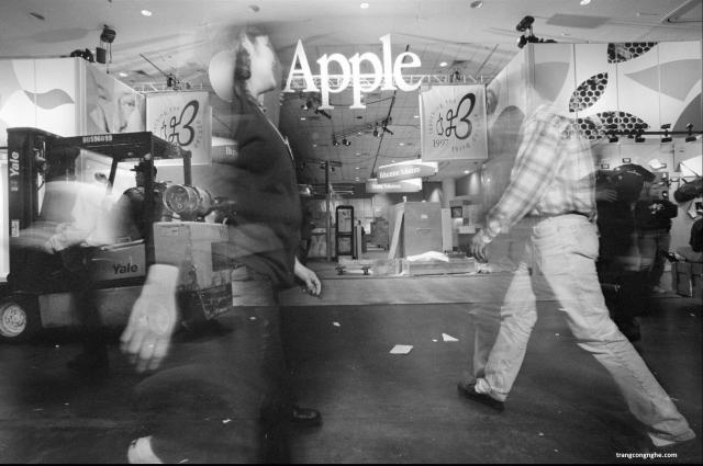 11. Các nhà cung cấp và công nhân đang bận rộn gần cửa hàng Apple tại triển lãm MacWorld tại San Francisco năm 1997. (Ảnh Morris/AP)