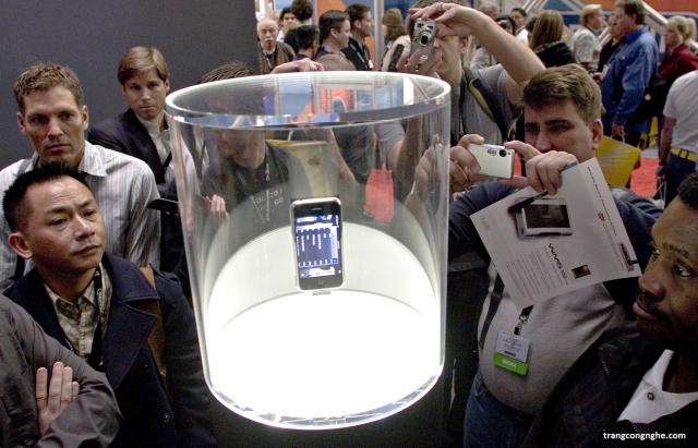 23. Appe đã lấn sân sang thị trường smartphone khi tiết lộ iPhone vào ngày 9/1/2007. Thiết bị này khác so với nhiều loại smartphone chủ yếu do nó tích hợp màn hình chạm thay vì bàn phím. Ở đây, các nhà báo tại sự kiện đang chiêm ngưỡng thiết bị này. (Ảnh Bloomberg News)