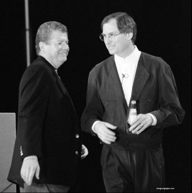10. Sau khi Spindler rời đi, Gil Amelio (bên trái) – giám đốc công nghệ tại National Semiconductor đã đảm nhận chức CEO. Jobs quay trở lại với vai trò người cố vấn. Tuy nhiên, sau khi Amelio rời đi, Jobs đảm nhận vai trò CEO tạm thời. Trong khoảng thời gian đó, Apple cũng mua lại công ty Next Computers của Jobs. Trong ảnh, Jobs và Amelio xuất hiện cùng nhau tại cuộc triển lãm MacWorld 1997.