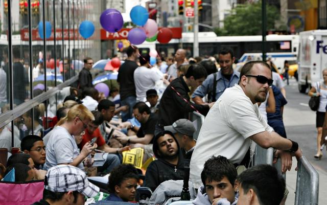 25. Ngày 29/6/2007, iPhone lên kệ và khách hàng phải xếp hàng rất lâu trước khi cửa hàng mở cửa bán thiết bị. Trong ảnh là hàng người xếp hàng bên ngoài cửa hàng Fifth Avenue Apple. (Bloomberg News)