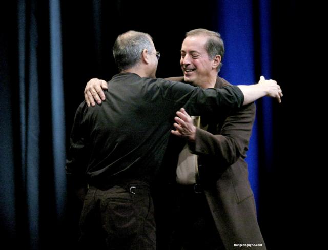 21. Năm 2005, Jobs cho biết công ty sẽ sử dụng chip Intel cho máy tính của họ. Đây là dấu hiệu cho thấy ông dự định bán laptop giá rẻ hơn. Trong ảnh, Tổng giám đốc Intel Paul Otellini ôm Jobs tại Sự kiện các nhà phát triển thế giới của Apple. (Ảnh Noah Berger/Bloomberg News)