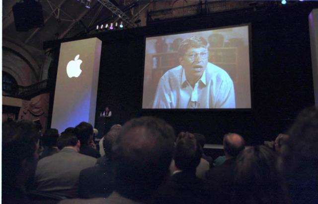 13. Năm 1997, Apple và đối thủ Microsoft đã hợp tác với nhau. Quan hệ đối tác được công bố vào ngày 6/8 tại sự kiện MacWorld thường niên của Apple. Trong ảnh, Chủ tịch của Microsoft Bill Gates xuất hiện trên màn hình thông qua đường dây điện thoại trong khi Job đứng trên sân khấu. ( Ảnh John Mottern / Agence France-Presse)