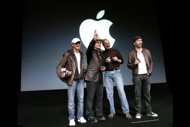 20. Vào tháng 9/2004, Jobs cho biết ông đã phẫu thuật để điều trị bệnh ung thư tụy và nghỉ ngơi một thời gian. Tuy nhiên, ông đã trở lại làm việc và tại sự kiện diễn ra ngày 26/10/2004 Jobs đã tiết lộ phiên bản màu đen đặc biệt của iPod với bánh xe trượt định hướng màu đỏ. Trong ảnh là ban nhạc U2 đang cầm mẫu sản phẩm. (Ảnh Noah Berger/Bloomberg News)