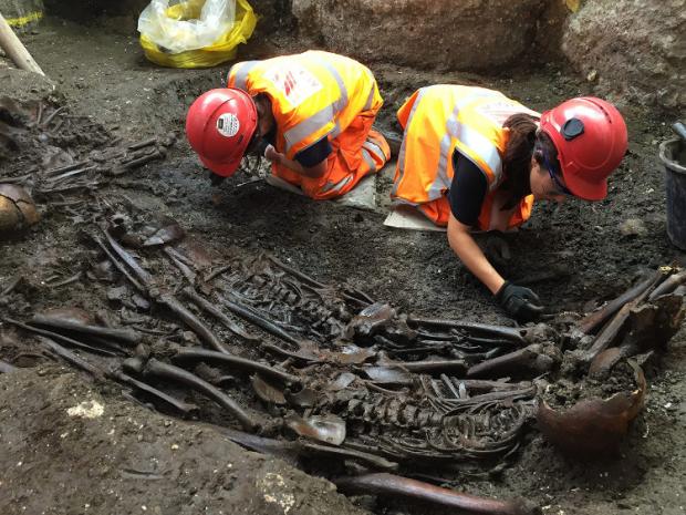 Các bộ xương người được khai quật ở nghĩa trang Bedlam vào tháng 7 năm 2015. (Ảnh: Crossrail).
