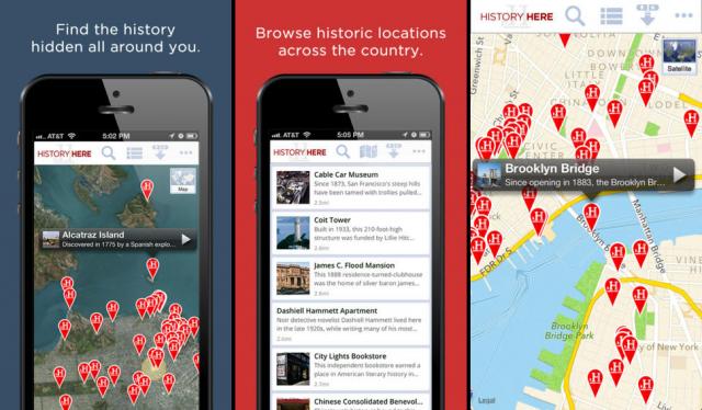 History Here là một hướng dẫn tương tác với hàng ngàn địa điểm lịch sử trên khắp nước Mỹ, với hình ảnh, video và các bản đồ. Bạn sẽ khám phá các địa điểm nổi tiếng và ít được biết đến gần đó gồm các kiến trúc, bảo tàng, chiến trường, tượng đài, hay các nhà nổi tiếng.