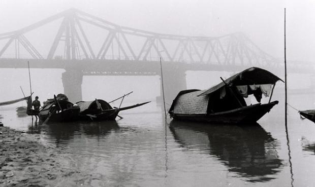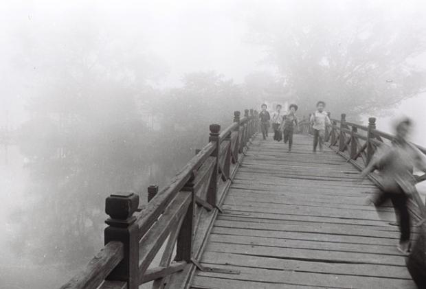 Những đứa trẻ nô đùa trên cầu Thê Húc dẫn vào đền Ngọc Sơn. Khi đó, cây cầu này màu đỏ son, làm bằng gỗ và có nhiều trụ liên tiếp.