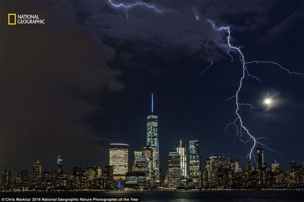 Những tia sét xuất hiện trên bầu trời sáng trăng ở Manhattan (Mỹ) trong cơn bão mùa hè. (Ảnh: Chris Markisz).