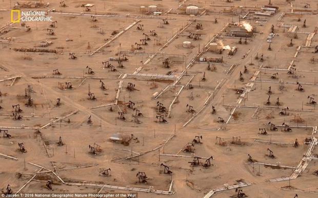 Các giếng dầu và bể chứa ở California (Mỹ) nhìn từ trên cao giống như những con côn trùng. (Ảnh: Jassen T).