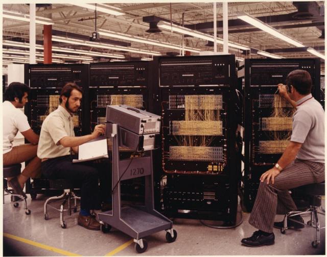 Ba người đàn ông trong ảnh đang làm việc trên các bảng mạch vào năm 1965.