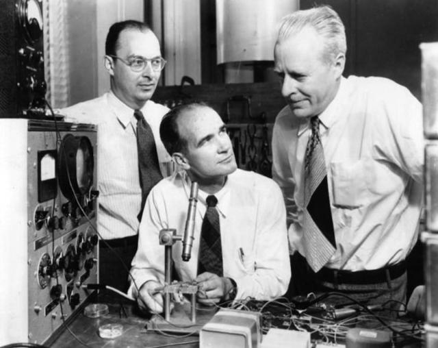 Mãi cho đến sau Thế chiến thứ 2 thế giới công nghệ mới thực sự bùng nổ. Năm 1947 William Shockley đã dẫn đầu một nhóm nghiên cứu có trụ sở tại Palo Alto ở Bell Labs đã phát minh chất bán dẫn khuếch đại đầu tiên trên thế giới - transistor. Transistor sẽ dẫn đường cho thiết bị điện tử nhỏ và rẻ hơn. Shockley sẽ giành chiến thắng giải Nobel Vật lý cho phát minh của mình. (Ảnh: Wehope / Wikimedia Commons; Nguồn: PBS, National Park Service)