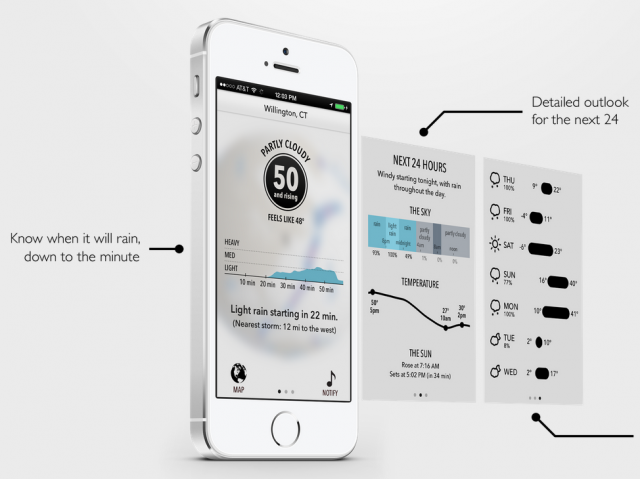 Dark Sky hiển thị dự đoán thời tiết từng phút cho địa điểm cụ thể trước một giờ, cho phép bạn biết chính xác khi nào trời sẽ mưa hay có tuyết. Các hình ảnh động thời tiết và bản đồ trông gọn gàng và đẹp.