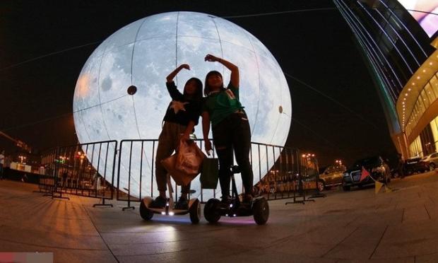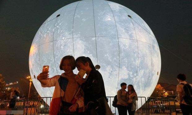 Các bạn trẻ chụp ảnh trước siêu mặt trăng có đường kính 8 m được thắp sáng rực rỡ.