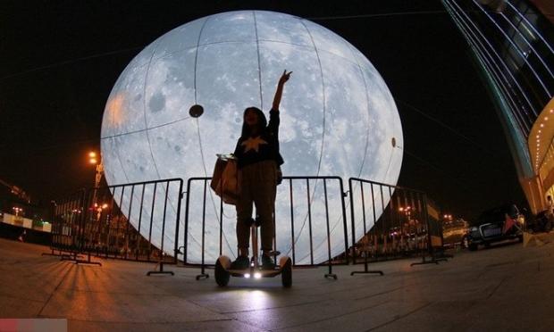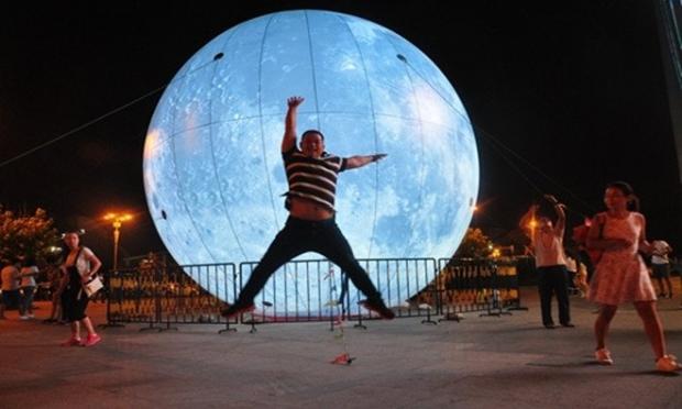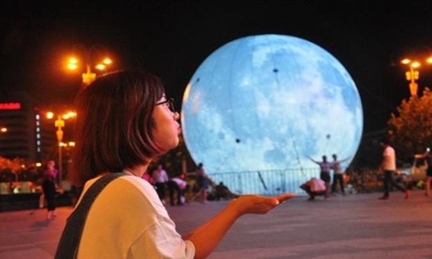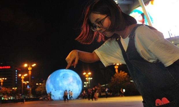 Một cô gái tạo dáng chụp ảnh cùng mặt trăng nhân tạo. Nhiều người dân thành phố tỏ ra thích thú với mặt trăng khổng lồ này.