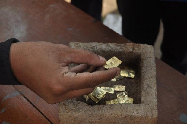 Những miếng vàng nằm trong chiếc hộp đá trên đảo Java, Indonesia. (Ảnh: Ganug Nugroho Adi).