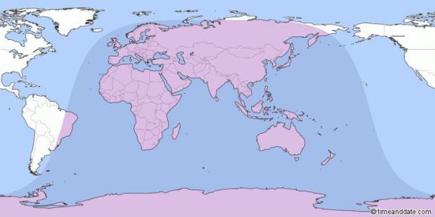 Những vùng quan sát được Nguyệt thực nửa tối nửa đêm 17/9 được tô màu tím. (Ảnh: TimeAndDate.com).