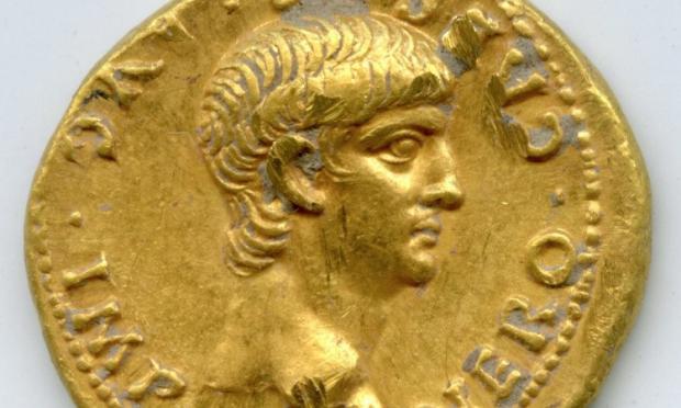 Đồng xu vàng khắc hình hoàng đế La Mã Nero. (Ảnh: UNC Charlotte).