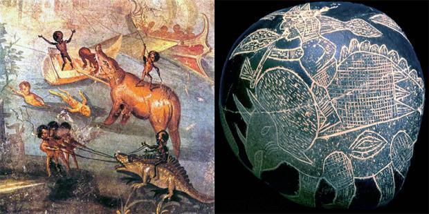 Bức bích hoạ người đang điều khiển khủng long như vật nuôi ngày nay của chúng ta ở Popeii (Trái) và hình người đang cưỡi khủng long khác làm vật di chuyển ở Inca (Phải).