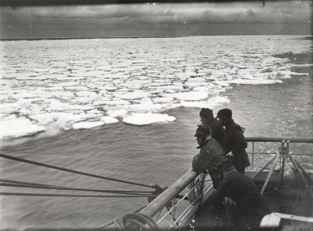 Đây là hình ảnh được chụp vào tháng 12 năm 1910, Robert Scott đã dẫn đầu nhóm nghiên cứu cho các chuyến thám hiểm Nam Cực, phi hành đoàn đang đứng trên boong tàu xem lá sen băng.
