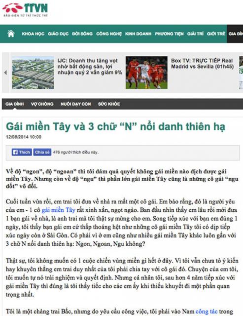 Bài viết với ngôn từ phản cảm nhanh chóng được nhiều trang mạng chia sẻ lại và khiến cộng đồng mạng phẫn nộ, nhiều độc giả cho rằng bài viết đã xúc phạm phụ nữ, gây chia rẽ vùng miền.
