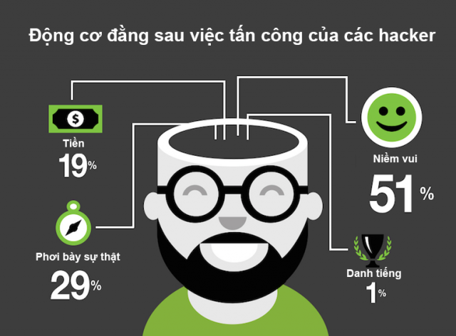 Đối với một tin tặc, động cơ tấn công mạng dường như không vì tài chính. Hơn một nửa số người được khảo sát nói rằng họ làm vì niềm vui và tìm kiếm cảm giác hồi hộp trong khi chỉ có 18% vì tiền bạc và 1% vì danh tiếng.