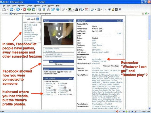 Facebook thủa sơ khai không có tin nhắn hoặc thông báo. Không có tường cá nhân hay cập nhật trạng thái. Chỉ có một hình ảnh được cho phép.