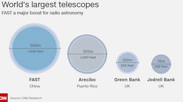Kính viễn vọng Hình cầu Khẩu độ 500m (FAST) có kích cỡ bằng 30 sân bóng đá, có thể phát hiện được tín hiệu vô tuyến và có thể là các tín hiệu của sự sống từ các hành tinh xa xôi.