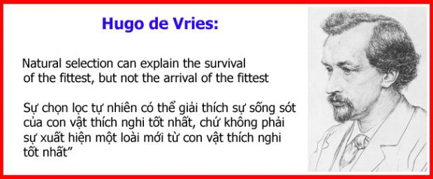 Nhưng lý thuyết di truyền của Mendel không cung cấp bất cứ một sự biến đổi nào như thế để làm chỗ dựa cho lý thuyết chọn lọc tự nhiên. Nói cách khác, những biến đổi của sinh vật để thích nghi với môi trường không hề làm thay đổi các đặc điểm di truyền, và do đó không tạo ra loài mới. Hugo de Vries đã tổng kết nhận định này bằng một tuyên bố bất hủ: