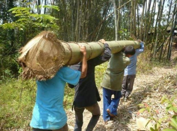 Một thân tre phải cần đến 4 người khiêng. (Ảnh: Thông tấn xã Thái Lan).