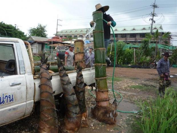 Một đoạn thân tre được rửa sạch trước khi được chất lên xe tải. (Ảnh: Thông tấn xã Thái Lan).
